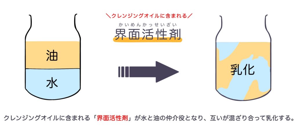 乳化とは、水と油のような本来混ざり合うことのない物質を物理的に混ぜ合わせることで均一の液体になる状態のこと。クレンジング以外にも、マヨネーズなどの調味料やドレッシングにも見られる現象です。