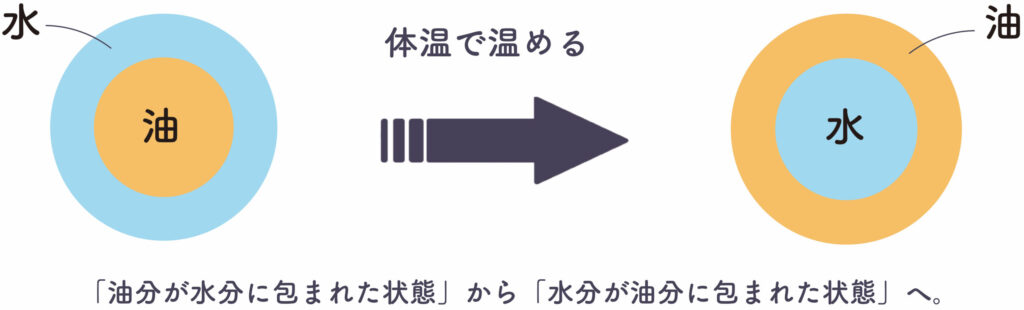 ジェルクレンジングの元の状態は「油分が水分に包まれている状態」です。しかし体温などで温めることにより、「水分が油分に包まれている状態」に逆転します。この現象のことを「転相」といいます。